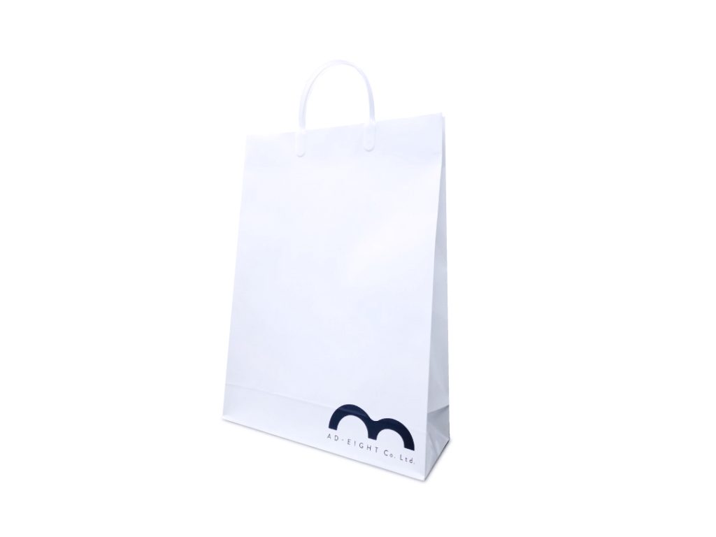 アドエイト様は、さまざまなプロモーションを手掛ける会社様です。WEBサイトからお問い合わせをいただいたことがきっかけでご縁となりました。ご訪問し、今までご使用されていた紙袋のサンプルをお預かりして打ち合わせをさせていただきました。真っ白な手提袋なので、保存期間が長いと黄ばみも目立つ仕様かと思います。少ない枚数でご対応でき、ご満足いただけましたこと、私どもも嬉しく思っております。スタイリッシュな内装の会社、アドエイト様ならではのデザインと機能性の手提げ袋になっております。